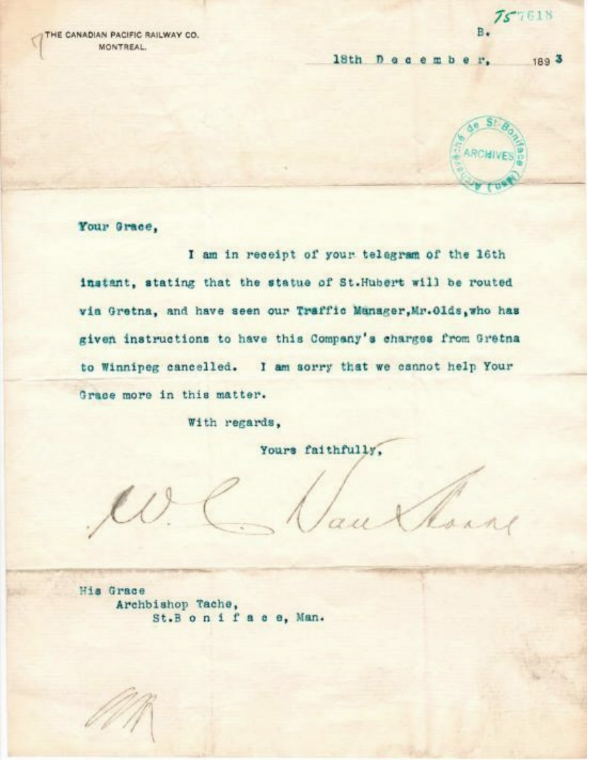 Lettre envoyée à Mgr Taché par Cornelius Van Horne du CPR du Canadian Pacific Raiway Co. le 18 décembre 1893. Archives de la Société historique de Saint-Boniface, Fonds CACRSB, Série Alexandre Taché, T57618.